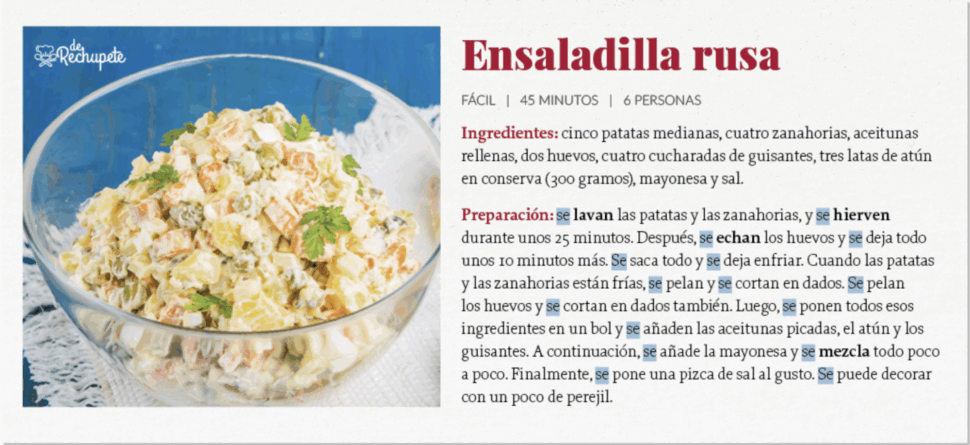 En las recetas observa la palabra se y el verbo que la sigue. A veces está en 3.ª persona del singular y otras en 3.ª del plural. ¿Sabes cuándo se usa cada una?